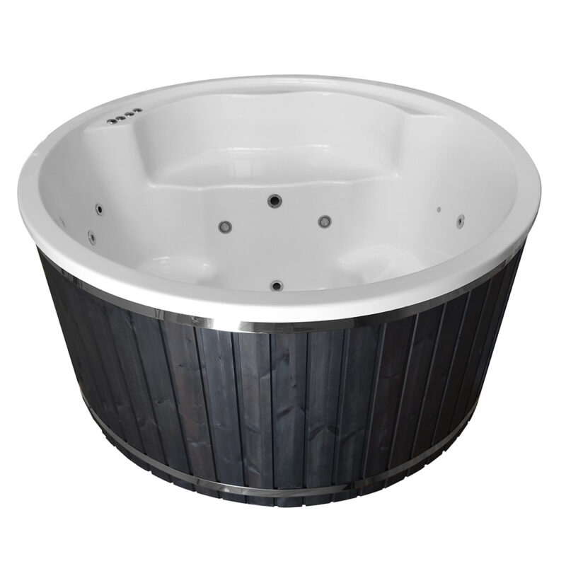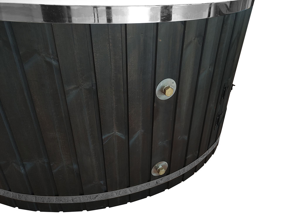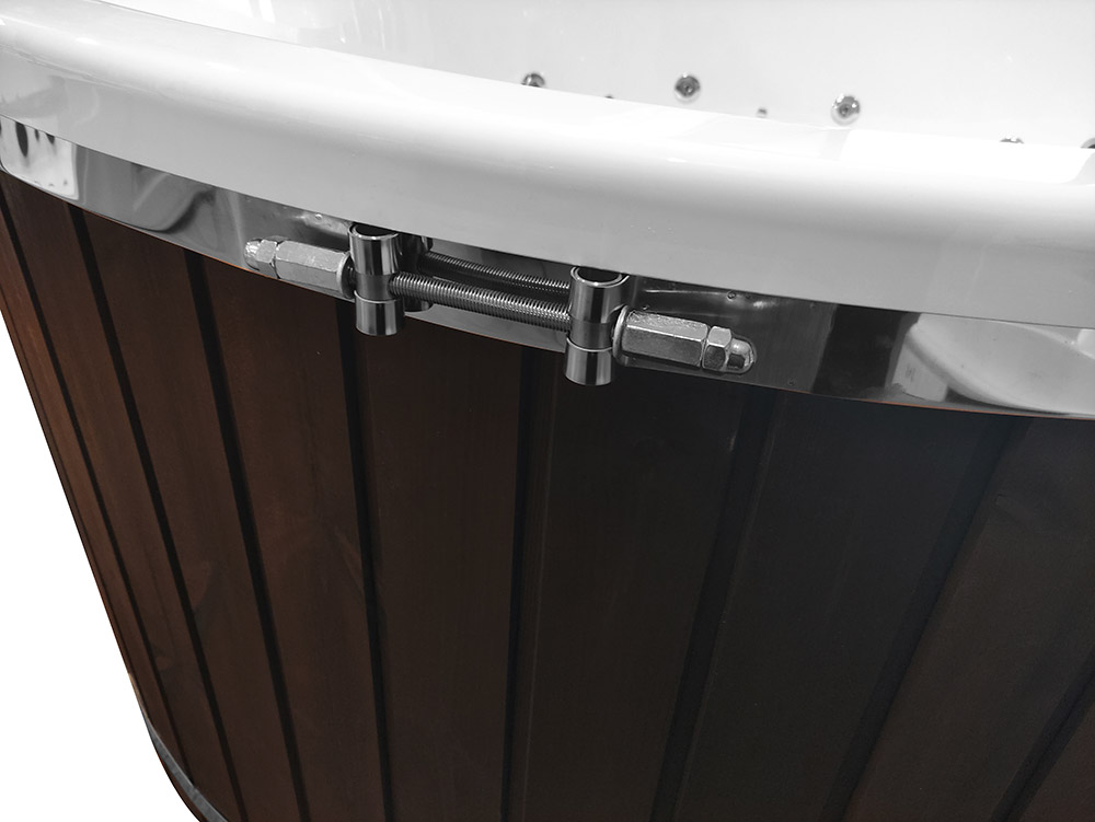 Celá vana je zasazena do obložení z dřeva Thermowood v barvě tmavého dubu. Thermowood je speciálně ošetřené dřevo, které se vyznačuje vysokou odolností proti povětrnostním vlivům, hmyzu a plísním. To dodává vaně přirozený a příjemný vzhled, který se perfektně hodí do prostředí zahrady.